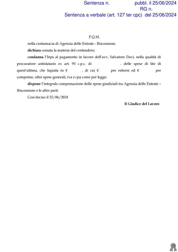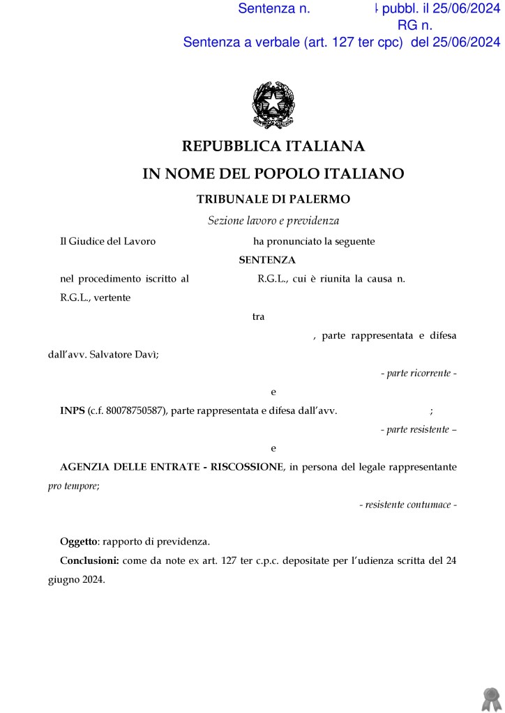 Con sentenza del 25 giugno 2024 il Tribunale di Palermo, Sezione Lavoro, ha accolto il ricorso proposto dalla ricorrente, difesa dall’avv. Salvatore Davì, ed ha annullato l’intimazione di pagamento emessa dall’ADER dichiarando non dovuti € 18.564,00 richiesti dall’INPS per contributi previdenziali condannando l’Istituto al pagamento delle spese legali.