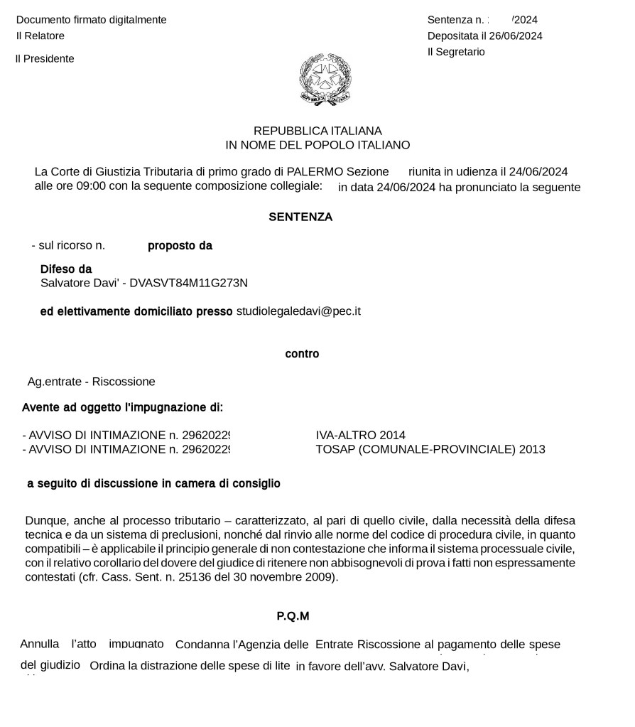 Accolto in questi termini il ricorso proposto dall’avv. Salvatore Davì, annullata l’intimazione di pagamento emessa per IVA e TOSAP.