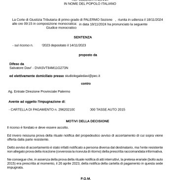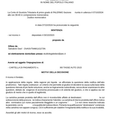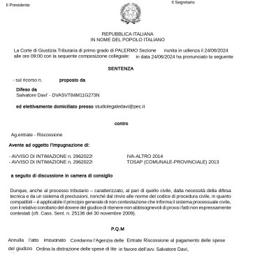 “Anche al processo tributario è applicabile il principio generale di non contestazione che informa il sistema processuale civile, con il relativo corollario del dovere del giudice di ritenere non abbisognevoli di prova i fatti non espressamente contestati” Accolto in questi termini il ricorso proposto dall’avv. Salvatore Davì, annullata l’intimazione di pagamento emessa per IVA e … More Il principio generale di non contestazione previsto in materia civile si applica anche al processo tributario.